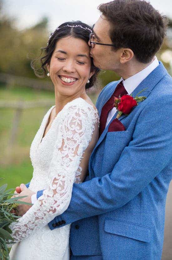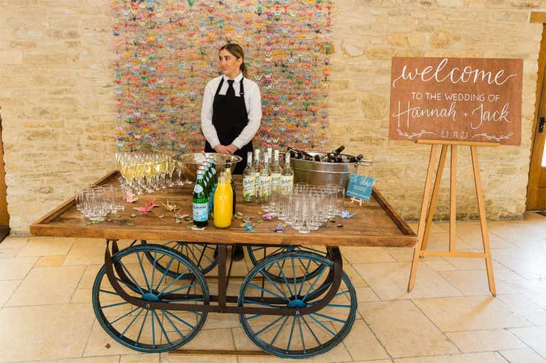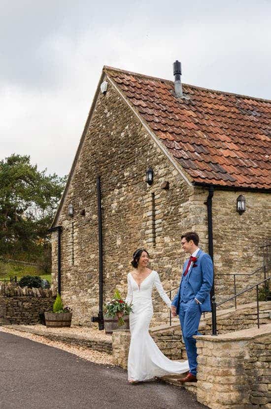 The couple married at Kingscote Barn, a 17th century barn in the Cotswolds. “I fell in love with it as soon as we walked in,” says Hannah. “The cosy atmosphere but spaciousness of the barn was perfect and left loads of room for creativity. We got married on 21st November 2021 (after postponing from 15th November 2020).”