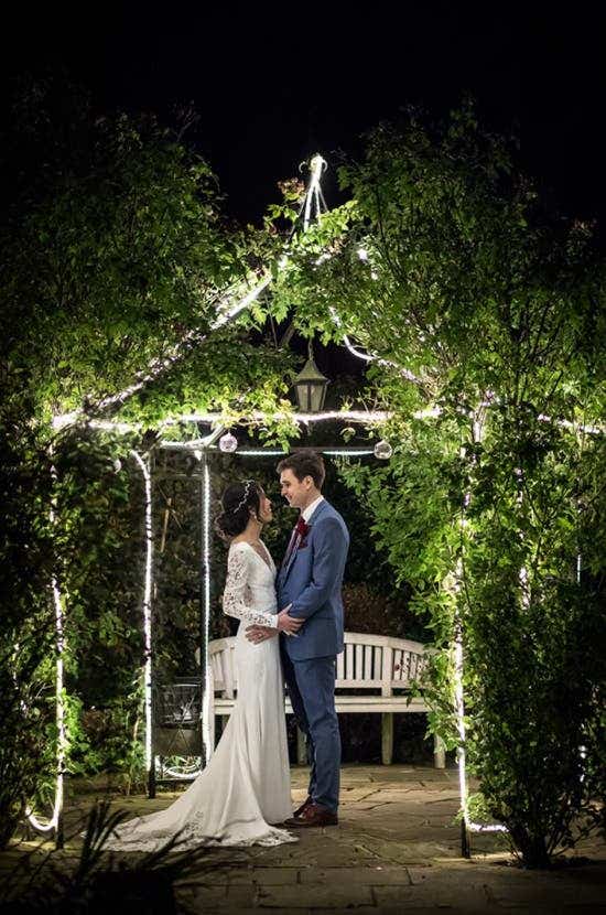 “Our semi-naked, three-tier cake was absolutely delicious and was displayed in front of the crane hanging display, inside a steel hoop decked out in foliage. We had a ceilidh band for the first half of the evening and a DJ for the second half, where we danced the night away under the fairy light canopy.”
