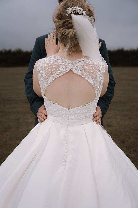 “I wanted a real princess dress and I chose Raelynn by Viva Bride,” says Lindsey. “The three-quarter-length sleeves immediately appealed to me and the A-line shape fitted me perfectly. My curves were nicely wrapped up in this dress and accentuated where they needed to be accentuated. I had a little panic, as the dress was no longer available in a size 38, but size 36 fitted me like a glove. Only the length of the dress had to be adjusted, so it was as if the dress was made for me.”