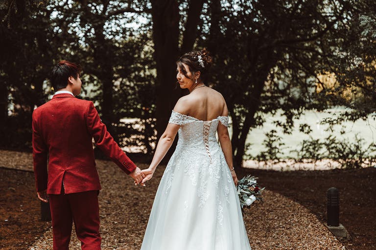 Vinny proposed in October 2021. “We were at Nottingham Theatre Royal to watch my favourite musical, Chicago,” says Bethany. “In the interval, we went to get a drink but I was led to an area that had been cordoned off. There was a table with a bottle of Prosecco and a present, which was a fancy Grimm’s Fairytale book that Vinny had cut a hole in for a ring box. He’d also written ‘Will you marry me?’ on the inside cover. When I turned around Vinny was on one knee behind me. I called him an idiot before I said yes but it was absolutely perfect! I was ecstatic, as it was the perfect way to propose, at my favourite show, with my favourite hobby (reading) and with my mum’s engagement ring, which he’d asked her for a few weeks before. Plus, a bit of booze to top it off!”